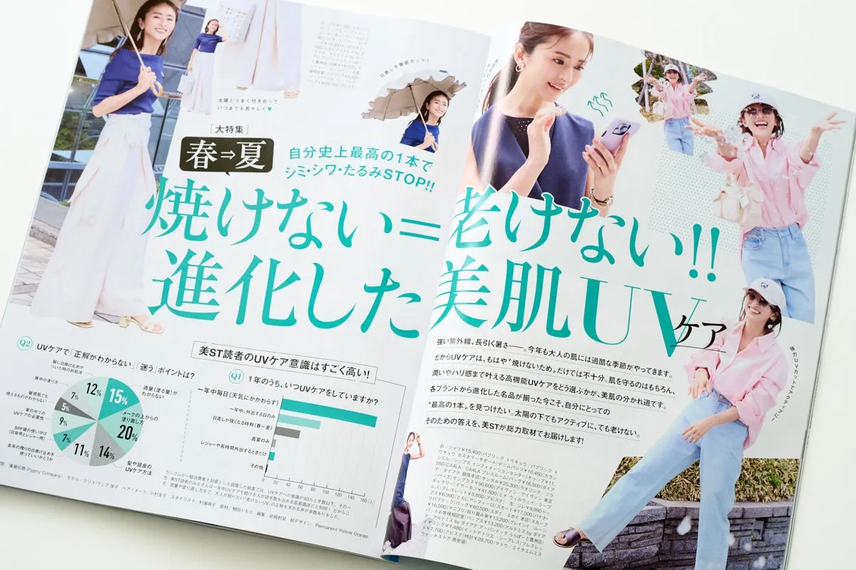 これらの意識や悩みに応えるべく、現在発売中の『美ST』6月号では「焼けない=老けない!進化した美肌UVケア」というテーマで大特集を組んでいます。今年の強い紫外線と長引く暑さに耐えうる、自分にぴったりのUVケア製品を見つけるための情報が盛り込まれています。多くのブランドから効果的なUV製品が登場している今、自分に合ったアイテムを見つけ出すためのヒントが詰まっています。
