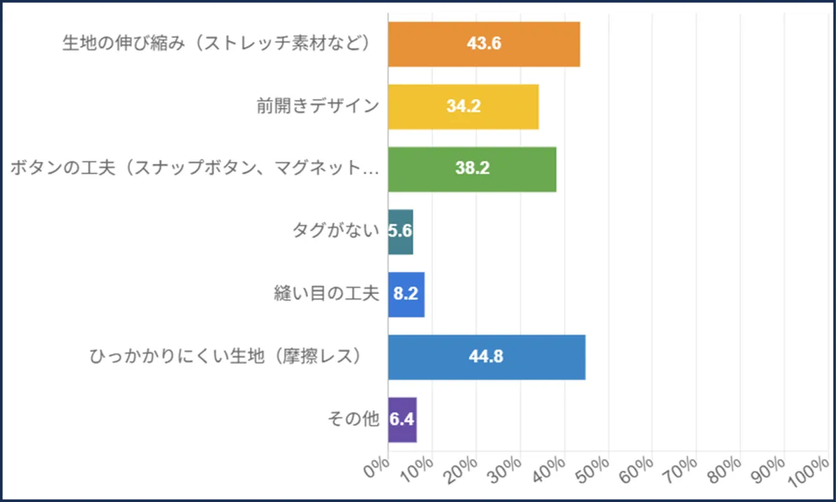 さらに、ストレスが「全くない」と答えた方の中でも、約36%が「伸縮性や摩擦レス」を求めていることが判明しました。これらを踏まえた上で、必要な機能のトップ3は「ひっかかりにくい生地」、「生地の伸び縮み」、そして「ボタンの工夫」であることが分かりました。