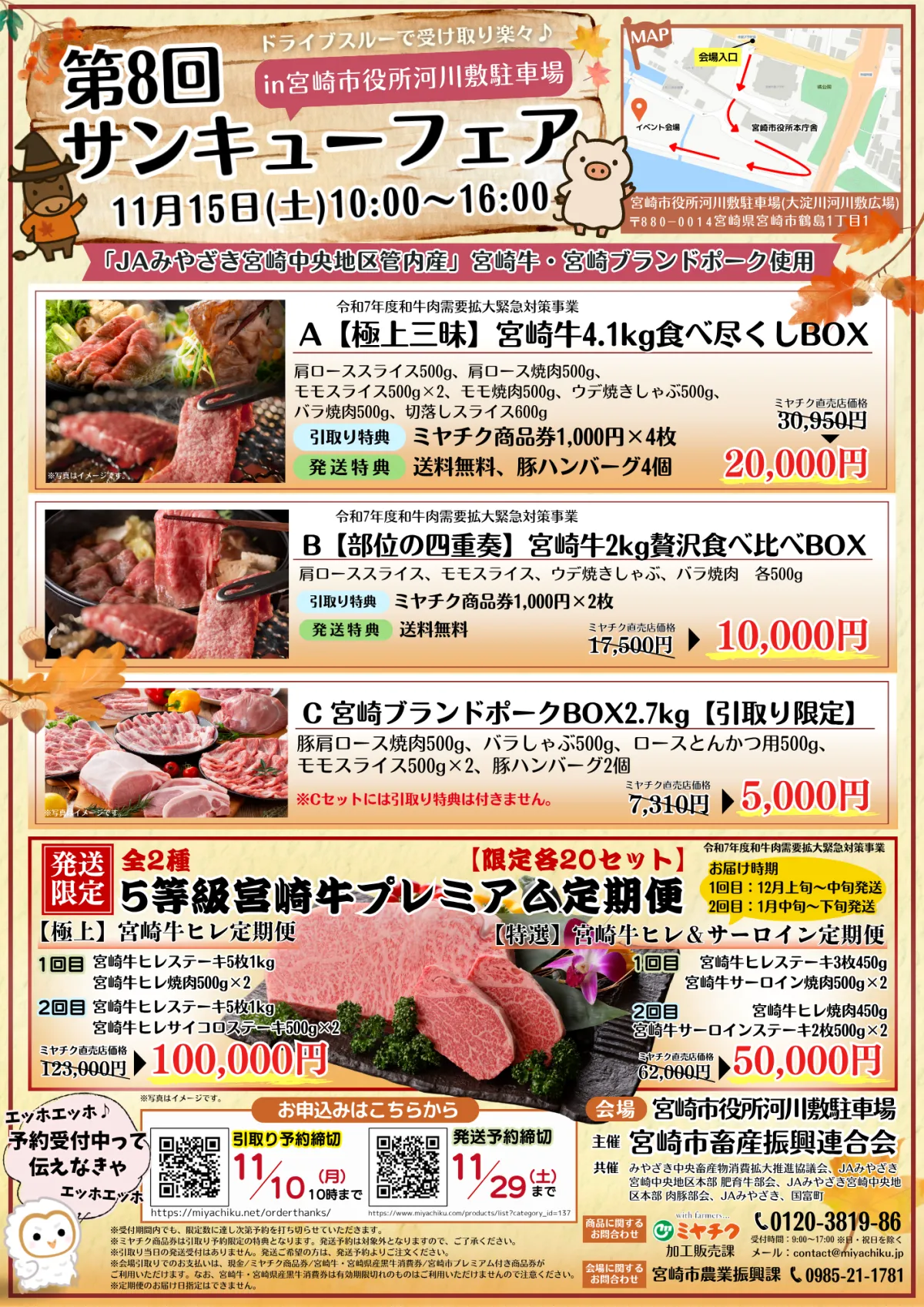 11月15日(土)、宮崎市役所河川敷駐車場にて「第8回 サンキューフェア」が開催されます。このイベントは、特別な年末年始の食卓を彩る宮崎牛やブランドポークをお得に購入できる絶好のチャンスです。