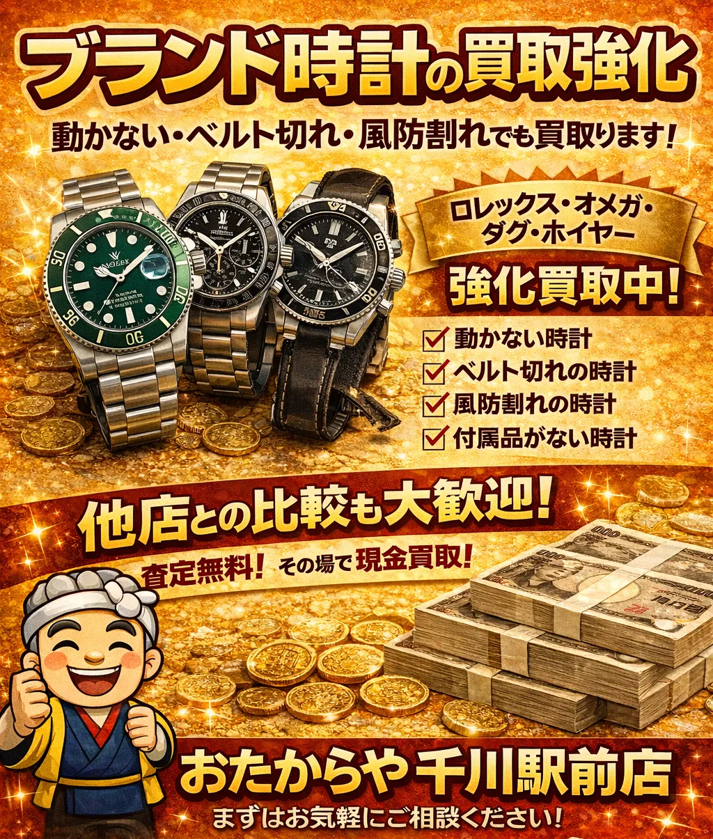 このたび、おたからや千川駅前店がブランド時計の買取を大幅に強化しました。時計市場は、ロレックスやオメガ、タグ・ホイヤーといった名だたるブランドからの需要が高まっており、買取ニーズも増加しています。