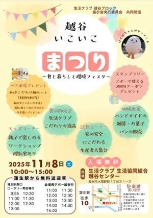 2025年11月8日(土)、埼玉県越谷市にある生活クラブ越谷センターで、『越谷いこいこまつり ~食と暮らしと環境フェスタ~』が開催されます。この祭りには、生活クラブと提携した23の生産者や団体が集まり、安心安全な食材や暮らしをサポートする商品が勢揃いします。