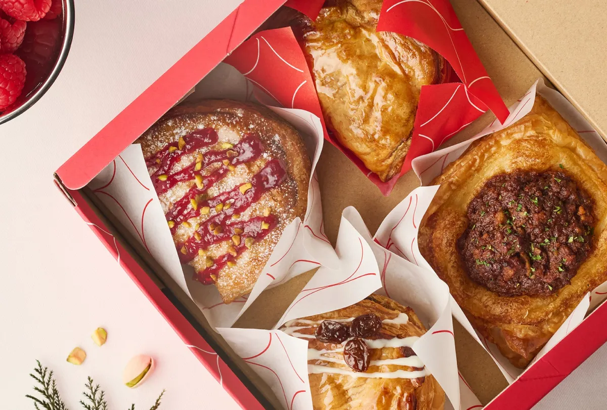 まず注目すべきは新商品「焼きたてカスタードアップルパイ ピスタチオベリー」。このパイは、ピスタチオの香ばしさと、フランボワーズジャムの酸味が絶妙に調和した、甘酸っぱさが特徴です。クリーミーなピスタチオカスタードが、蜜漬けりんごと一緒に包まれ、口の中で広がる風味は、ホリデーの華やかさにぴったりです。また、赤いトッピングは、見た目にも楽しく、パーティーの雰囲気を盛り上げます。