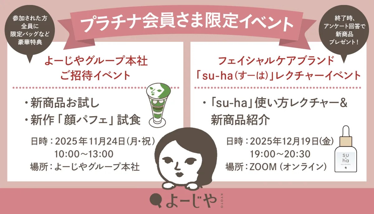 京都のライフスタイルブランド、「よーじや」からのお知らせです。この度、「よーじやメンバーズ」のプラチナ会員さま向けに、特別なイベントを開催いたします。2025年11月24日(月・祝)と12月19日(金)の二日間、プラチナ会員限定での特別な体験が実現します。気になるイベントの内容をご紹介いたします!