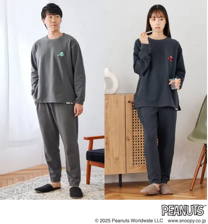 この新作フリースタイプは、可愛らしいスヌーピーとウッドストックが刺繍されたトレーナーと、スヌーピーが覗くポケットデザインのパンツで構成されています。寒さが厳しくなるこれからの季節でも、暖かく快適に過ごせるスタイルです。