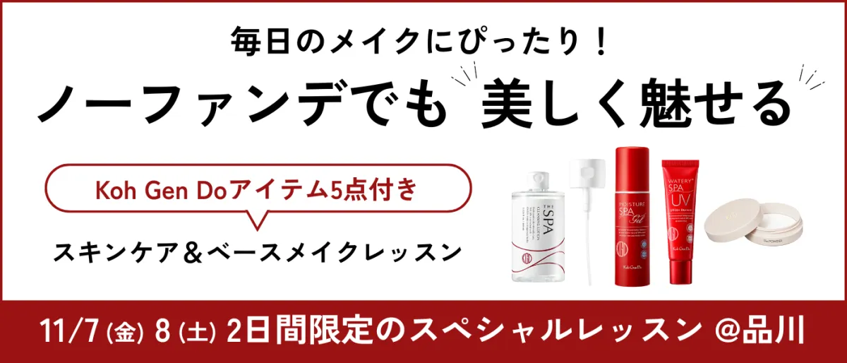 2025年11月7日(金)と8日(土)、東京・品川で開催される「Koh Gen Doアイテム付きスキンケア&ベースメイクレッスン」では、話題のコスメブランド「Koh Gen Do」の製品を使った独自のメイクテクニックを学べる絶好のチャンスです。このイベントは、メイクを楽しみながらも忙しい日常を送る女性たちにぴったりの内容になっています。