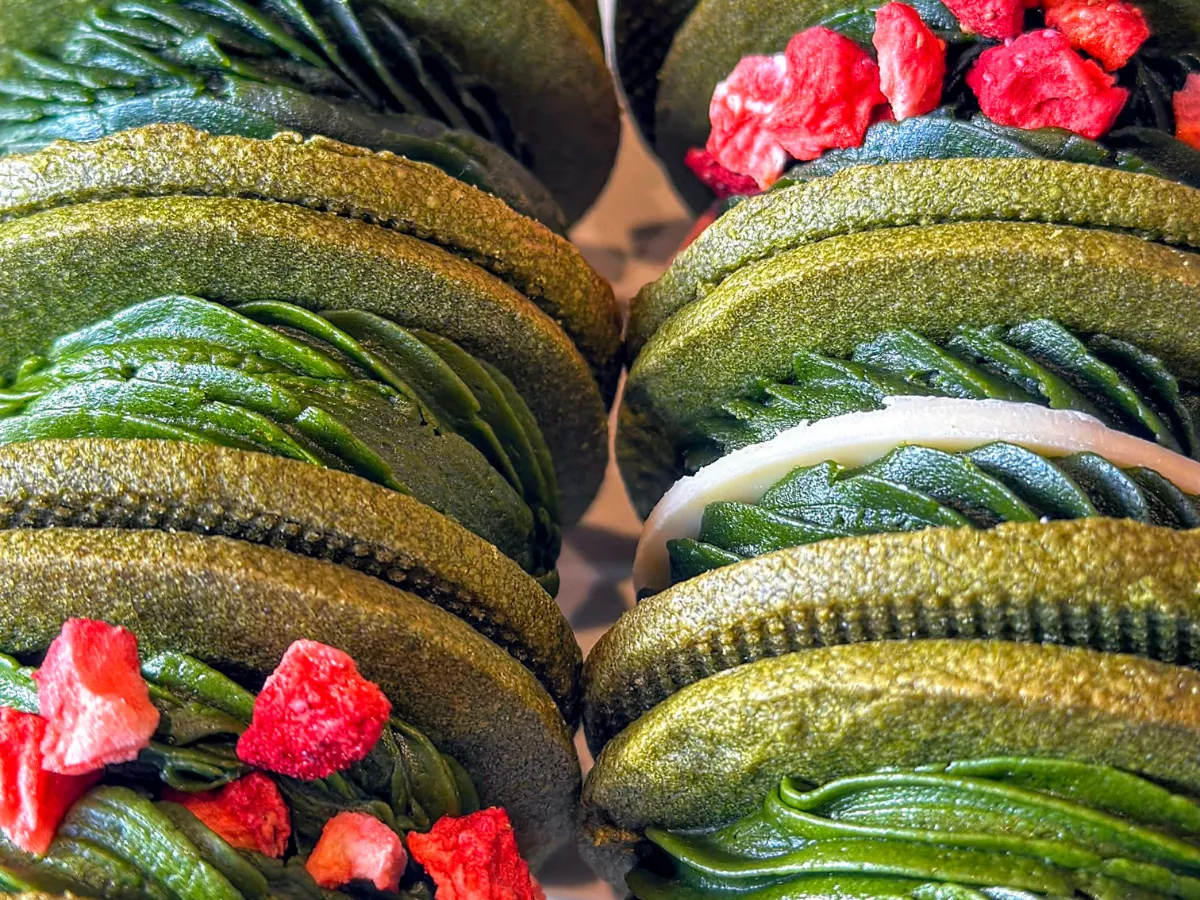『濃厚抹茶バターサンド』は、3種類のフレーバーがセットで楽しめます。プレーン、抹茶ホワイトチョコ、抹茶苺の各フレーバーはそれぞれの特徴があり、濃厚な抹茶の味わいをしっかりと感じることができます。特に抹茶ホワイトチョコは、まろやかさと抹茶の風味が絶妙に組み合わさり、苦味を抑えた甘さが絶妙です。抹茶苺は、抹茶とイチゴの酸味が合わさった新感覚の味わいで、フルーツとのバランスが楽しめる一品です。