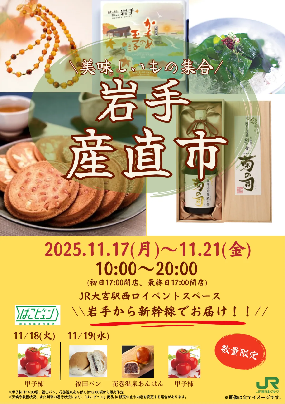 11月18日と19日には、東北新幹線「はこビュン」サービスを利用した特別販売も行われ、甲子柿や福田パン、花巻温泉あんぱんが数量限られて販売されます。これらの地元特産物は、その日限りの特別なアイテムですので、お見逃しなく!