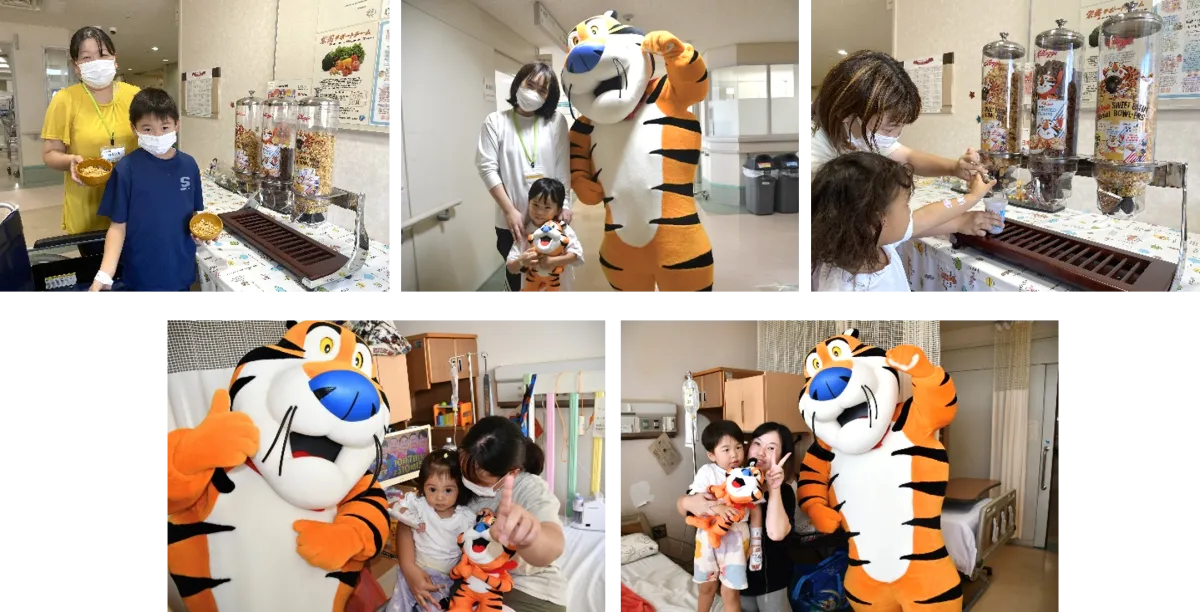贈呈式当日には、ケロッグの人気キャラクター「トニー・ザ・タイガー」も病院を訪問し、子どもたちにエールを送りました。多くの子どもたちが笑顔で迎え、思い出に残るひとときを過ごしました。