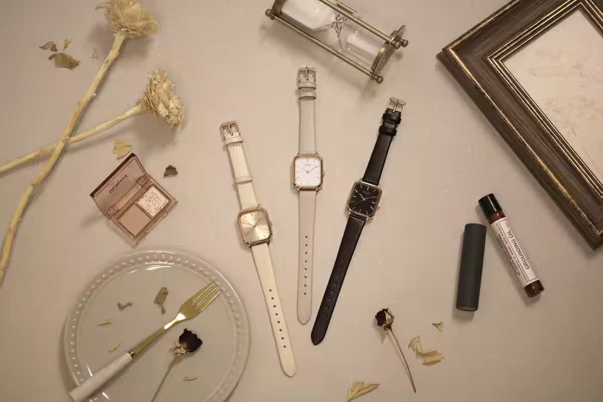新作の時計は、ヴィンテージテイストを取り入れたレクタンギュラー型(長方形)ケースが特徴です。角をあえて丸くしたことで、柔らかな印象を与え、カジュアルからフォーマルまで多様なファッションに合わせやすくなっています。また、全5色のカラーバリエーションから選べるため、自分のスタイルにぴったりの一本が見つかるでしょう。