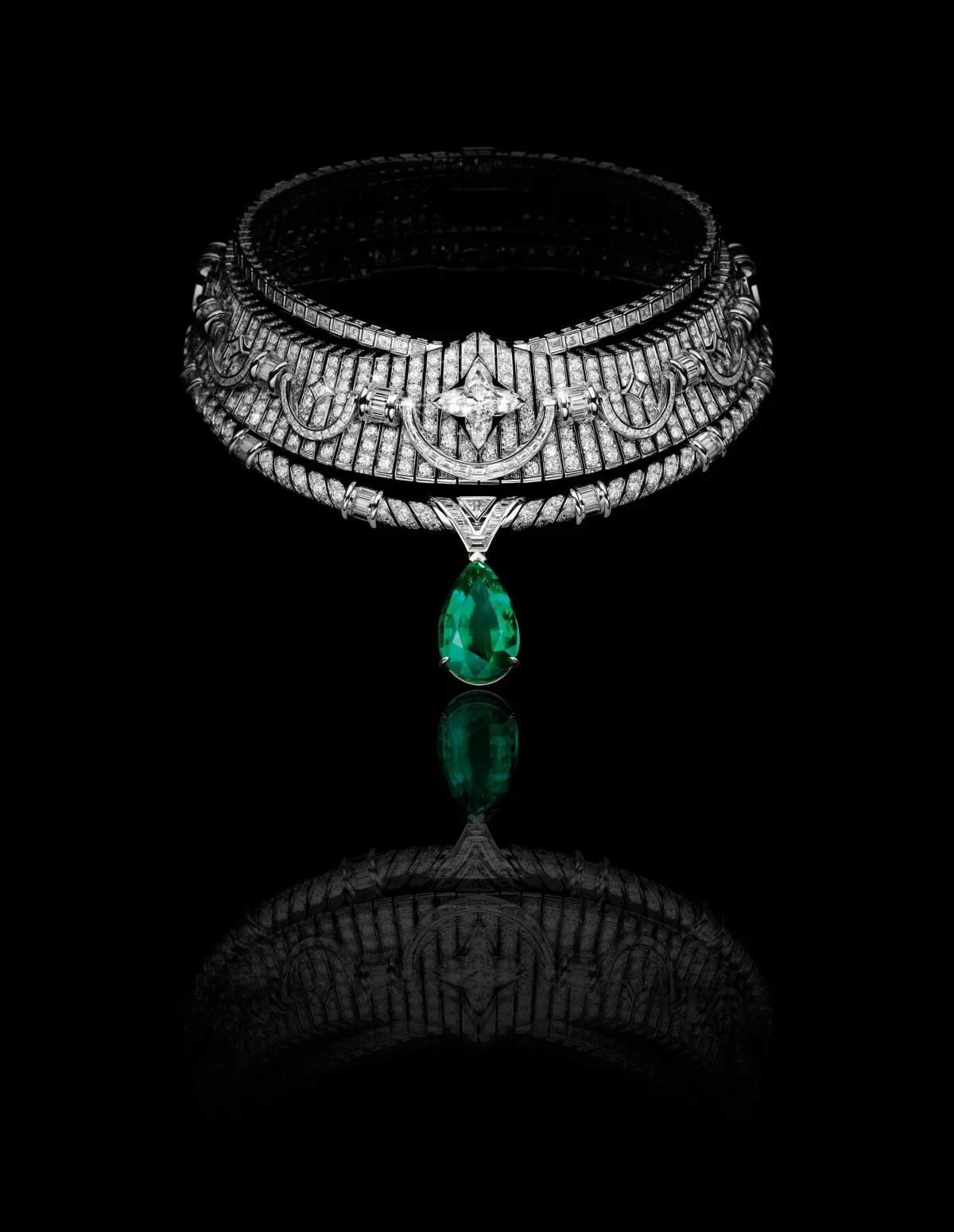 「Apogée」は、一見大胆なデザインに見えますが、その背景にはしっかりとした構造が存在します。ネックレスには、ホワイトゴールドやプラチナ、そして目を奪うブラジル産の30.75カラットのペアカットエメラルドがあしらわれています。さらに、LVモノグラムスターカットダイヤモンドが贅沢に使用され、全体の輝きを引き立てています。
