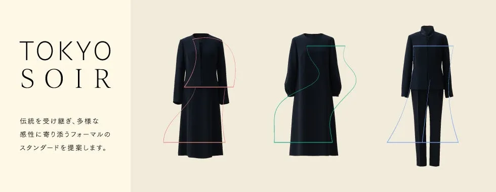 人々が「大切な日」として冠婚葬祭を捉える意識が広がる中、特に一般葬では「きちんとした装い」が求められ、「自分に似合い、長く着られる高品質な製品」に対するニーズも増しています。このようなニーズに応えるべく、TOKYOSOIRはアンサンブル、ワンピース、パンツスーツの3タイプを展開し、フォーマルウェアのスタンダードを打ち出しています。