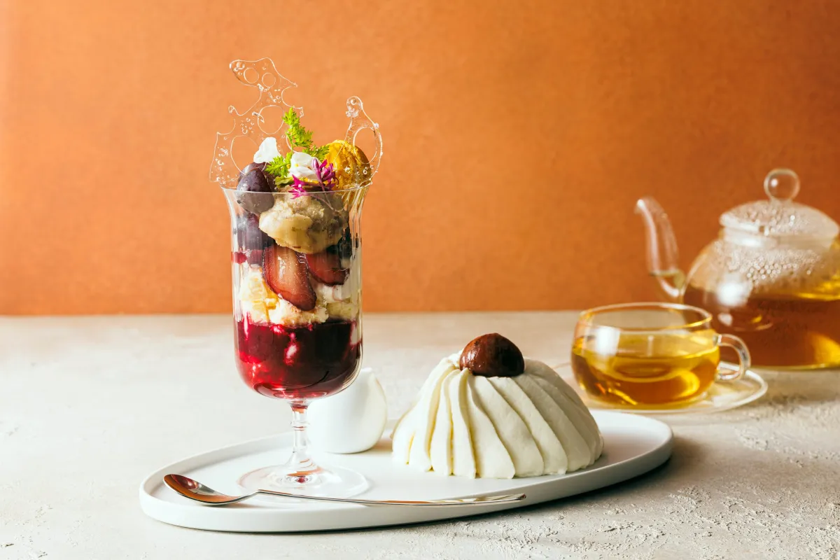 自由が丘店と梅田店では、さらに贅沢なメニューが楽しめます。スフレモンブランとセットで提供される「ぶどうと秋果実のパルフェ」は、様々な秋の味覚が重なり合った豪華な一品。濃厚なカシスピュレと自家製のレモンバーベナシロップの爽やかな組み合わせが、アールグレイ風味のマスカルポーネクリームや、赤ワインで煮た洋ナシと完璧にマッチ。日常の疲れを忘れさせてくれる美味しさです。