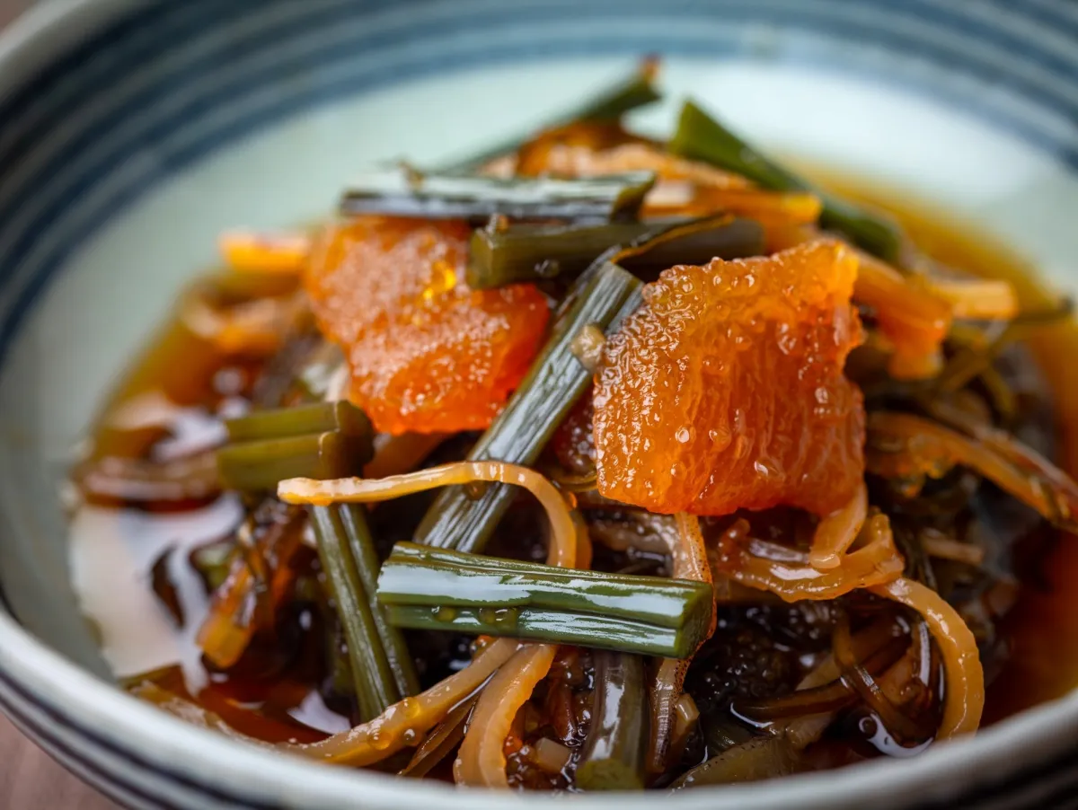 松前漬けは、数の子や昆布、イカなど新鮮な海の幸が詰まった贅沢な仕立てです。さらには、西わらびの持つなめらかなとろみが、松前漬けの風味と見事に融合し、今までに感じたことのない美味しさを生み出しています。様々な食材の食感が楽しめるこの商品は、ぷちぷち・こりこり・とろとろの異なる食感が一皿に詰まっており、まさに満足感のある一品です。