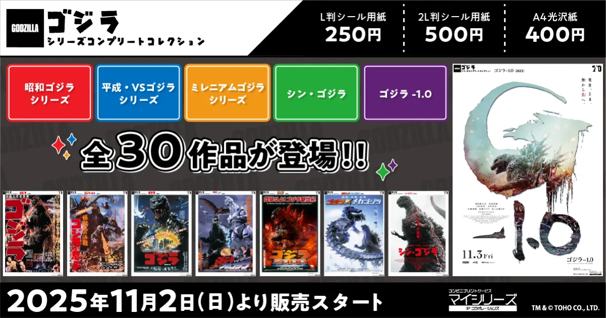 今年のゴジラの日には、全国に約30,000店舗あるファミリーマート、ローソン、ミニストップ、ポプラのマルチコピー機を利用して、歴代ゴジラシリーズのポスターや場面カットをプリントすることができます。『ゴジラ シリーズ コンプリートコレクション』として提供されており、高画質で名場面が楽しめるチャンスです。