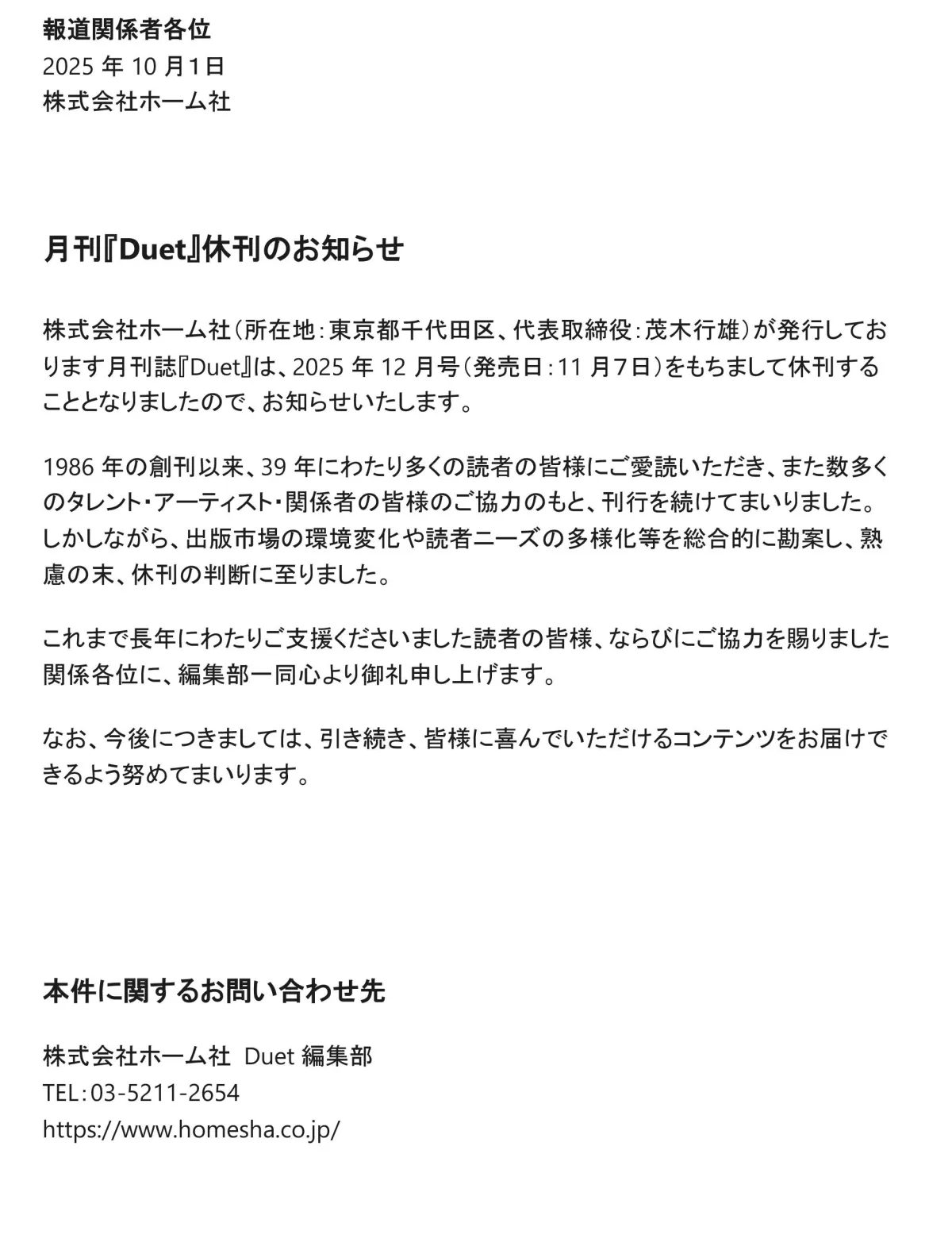 『Duet』の編集部は、長年の応援に感謝しつつ、新たな形で読者とのつながりを続けていくことを表明しています。“新しいスタート”として、これからの活動に期待を寄せたいものです。