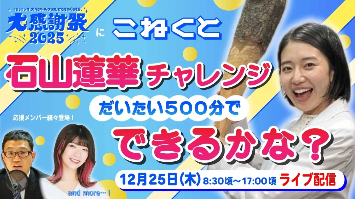 2025年12月25日(木)8:30から始まる特別番組『TBSラジオ大感謝祭2025』に合わせて、注目パーソナリティの石山蓮華さんがLIVE配信イベント「石山蓮華チャレンジ!だいたい500分で、できるかな?」を開催します。これはTBSラジオが提供する特別な機会で、蓮華さんの魅力を存分に堪能できる絶好のチャンスです。