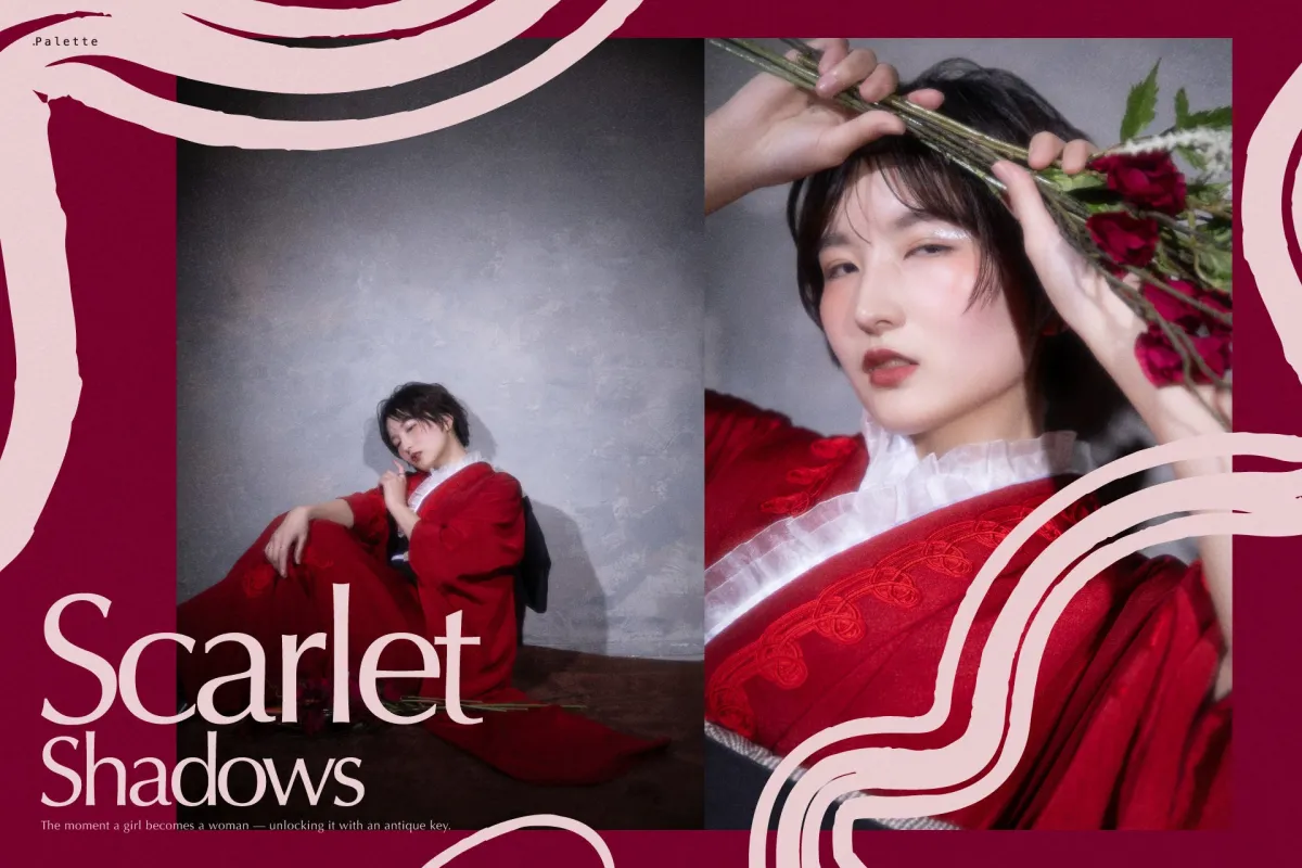 成人式と言えば、やはり振袖。一番の人気色である赤は、日本の伝統を象徴しますが、最近ではそれに斬新なアプローチが求められています。『Scarlet Shadows』では、伝統的な赤い振袖に「影(シャドウ)」を加えることで、成人を迎える女性たちが持つ強さと独自の魅力を際立たせます。スタジオライティングを駆使して、燃え上がるようなスカーレットが、甘さだけではない、大人の女性へと成長を促す妖艶さを表現しています。