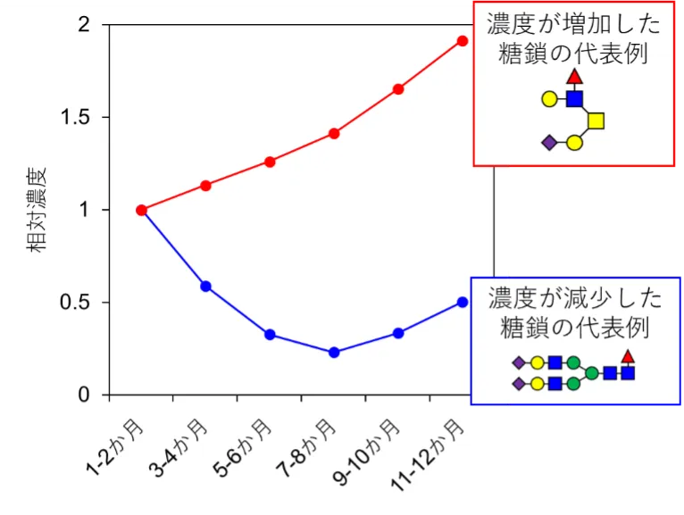 今回の研究では、20名の母親から提供された母乳を使い、出産後の日数ごとに28種類の糖たんぱく質糖鎖の濃度を最新の分析技術で測定しました。