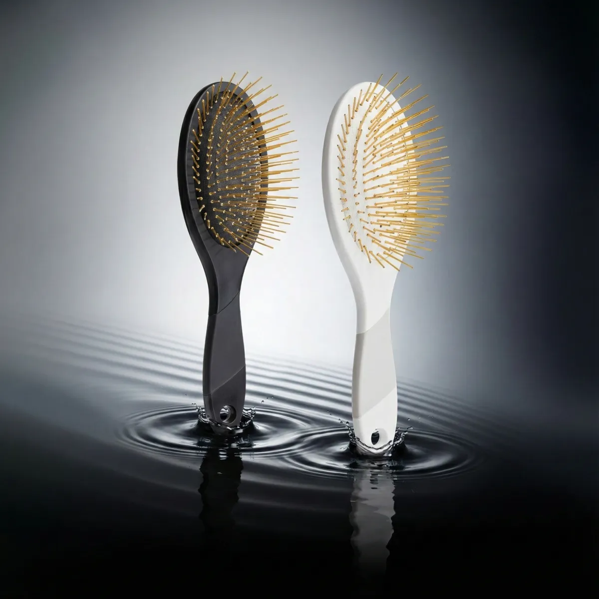 このカッサブラシの特徴はまず、そのデザインと素材にあります。従来の木製ハンドルから進化し、水に強く、軽量で耐久性の高いプラスチック素材を採用。ユーザーからのフィードバックをもとに、持ち手は安定したグリップ感を提供するよう改良されました。また、24K金メッキのピンは健在で、その上質感と機能性がさらに向上しています。これにより、頭皮が適度に刺激され、疲れやストレスを緩和する効果が期待できます。