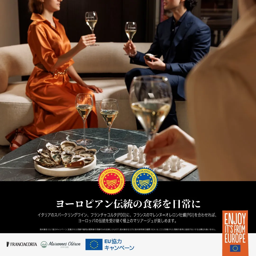 このキャンペーンは、フランチャコルタ(PDO)とマレンヌ=オレロン牡蠣(PGI)の組み合わせを通じて、心豊かな味わいの体験を提供します。各製品の背景にある地域的・文化的なストーリーにも注目しながら、洗練された稀少な味わいを楽しめるチャンスです。