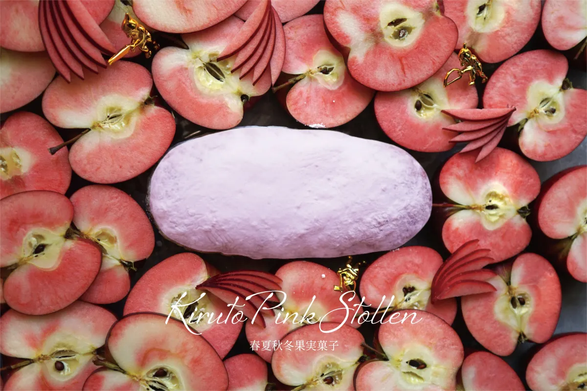 シュトーレンの制作を手がけるのは、パン職人の加藤太一氏がオーナーを務める『JOURS』。彼は“シュトーレンの魔術師”として多くのファンを持つ存在です。今回、加藤氏は宮下果樹園のキルトピンクを使い、単なるシュトーレンにとどまらない逸品を生み出すべく、一からデザインを行いました。
