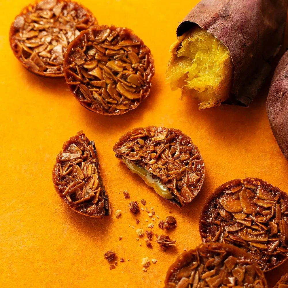 新商品の「キャラマーサンド スイートポテト」は、一口食べればその魅力に虜になること間違いありません。アーモンドフロランタンとバターサブレが華やかな甘みを演出する中に、ミルクチョコレートとともにさつま芋、バター、生クリームを絶妙に合わせたスイートポテトキャラメルがサンドされています。甘く、やわらかな食感が特徴のこのキャラメルは、ふわっと広がるさつま芋の風味と濃厚なとろけるキャラメルが絶妙に絡み合います。