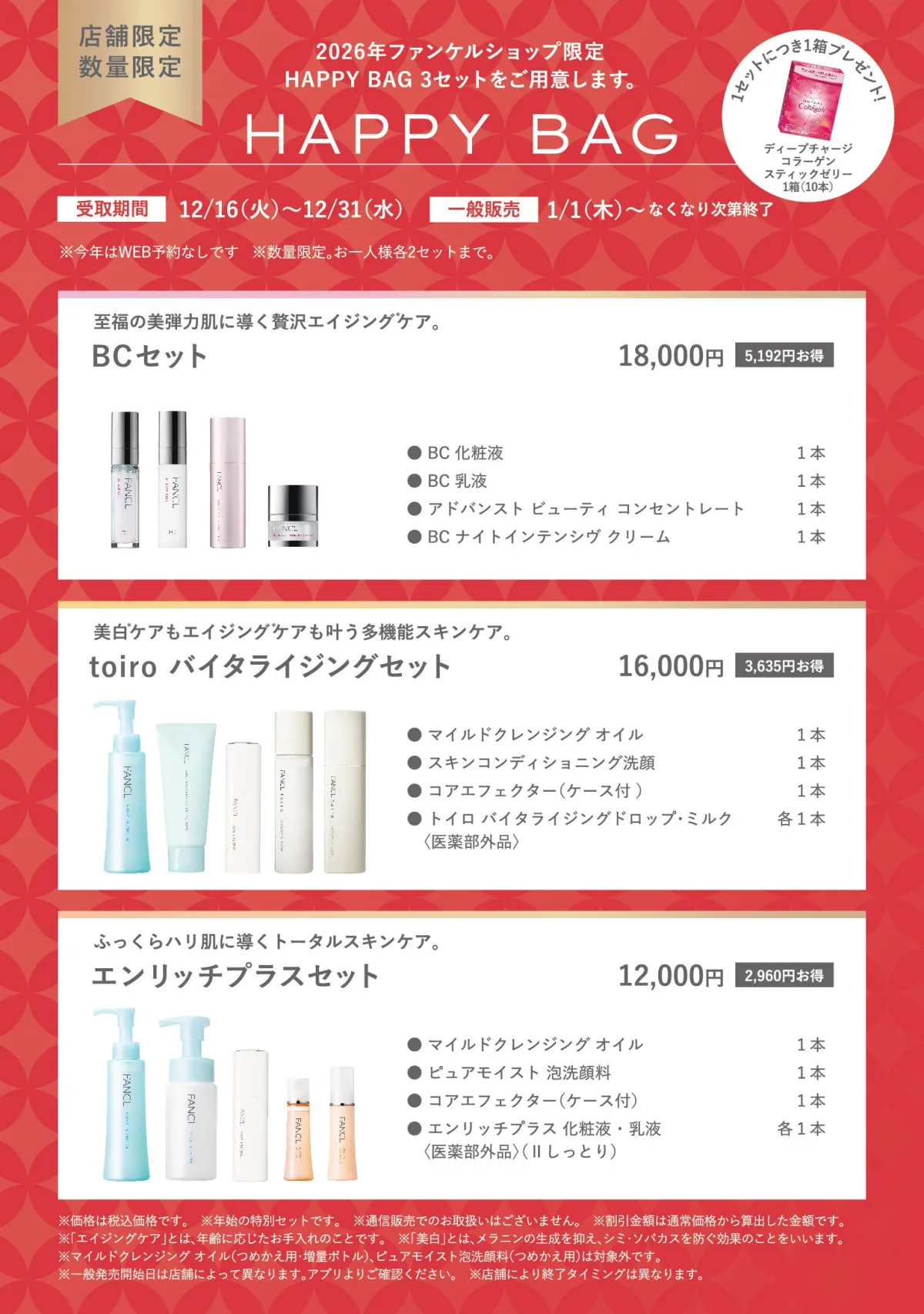 直営店舗では「HAPPY BAG 2026」が数量限定で発売されます。この新春特別セットを購入すると、おまけとして「ディープチャージ コラーゲン スティックゼリー」がもらえる嬉しいキャンペーンも実施中です。