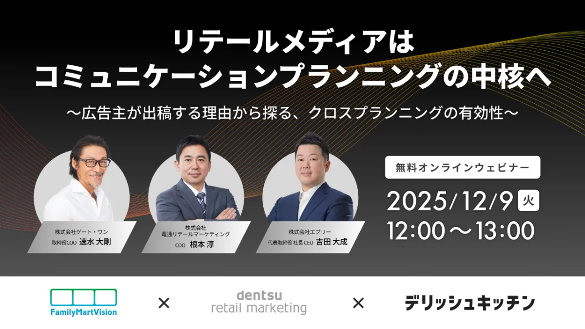 2025年12月9日、株式会社ゲート・ワンが主催するウェビナーが開催されます。このイベントは、株式会社エブリー及び株式会社電通リテールマーケティングとの共同企画であり、リテールメディアの最新の状況や今後の展望について深く掘り下げる内容となっています。