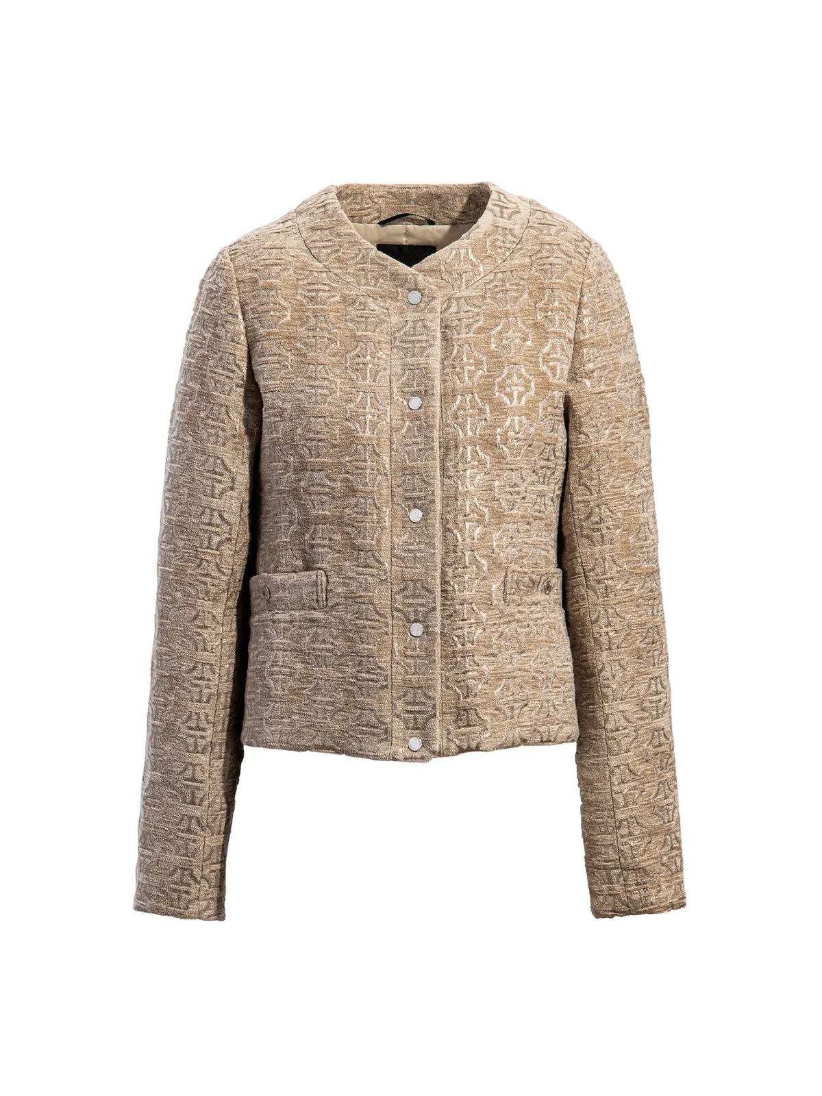 生地の構造は、太めのモール糸と箔を重ねることで実現されており、西陣織の特性でもある複雑で三次元的な表情が生まれています。モール糸の隙間から見える箔の輝きが、TATRASのアイコンを引き立て、伝統と現代の洗練された融合を表現しています。