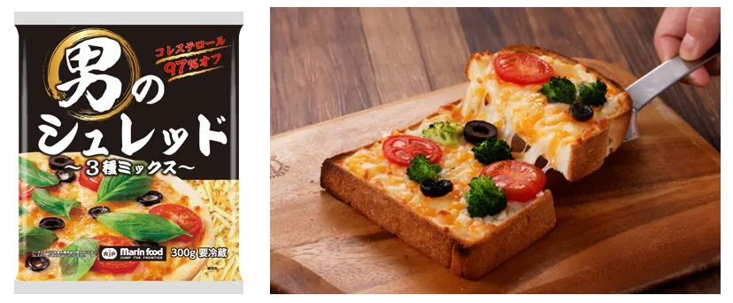 『男のシュレッド』は、従来のチーズの主成分である乳脂肪を植物油脂に置き換え、乳たん白を使用して乳化させた100%植物性のチーズ代替品です。従来のゴーダチーズに比べてコレステロールを大幅にカットし、健康志向の高い消費者でも安心して食べられる仕様となっています。また、赤色のシュレッドを配合することで、彩り鮮やかな見た目を実現しつつ、複数の『スティリーノ』をミックスすることで、コクのあるチーズ風味を楽しめます。