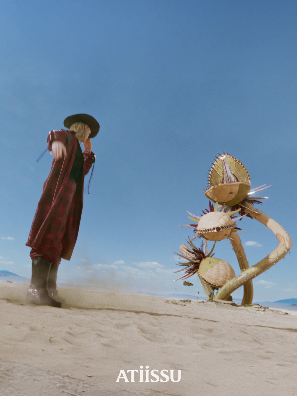 4月28日のコレクションローンチと同時にオープンする「DESERT COWBOY COLLECTION」ポップアップショップは、現代的なウェスタンカウボーイのイメージを再解釈した空間となっています。ここでは、キャンペーン映像に登場するFelixが着用したアイテムを実際に試着でき、AI技術を活用したフォトブースも設置され、ATiiSSUの魅力的な世界観を体験できます。
