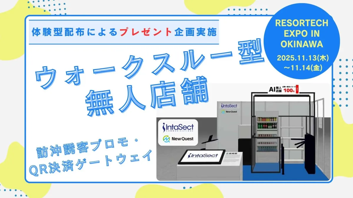 今回のイベントでは、インタセクト・コミュニケーションズ株式会社と新たに設立されたNew Quest株式会社が共同で出展します。ブースでは「ウォークスルー型無人店舗」のデモがあり、来場者は実際に体験することができます。この店舗システムは、QRコードをかざすだけで入店でき、AIカメラとセンサーによって自動的に商品情報が認識される仕組みになっています。これにより、レジを待たずスムーズに買い物ができる新しい体験を提供します。