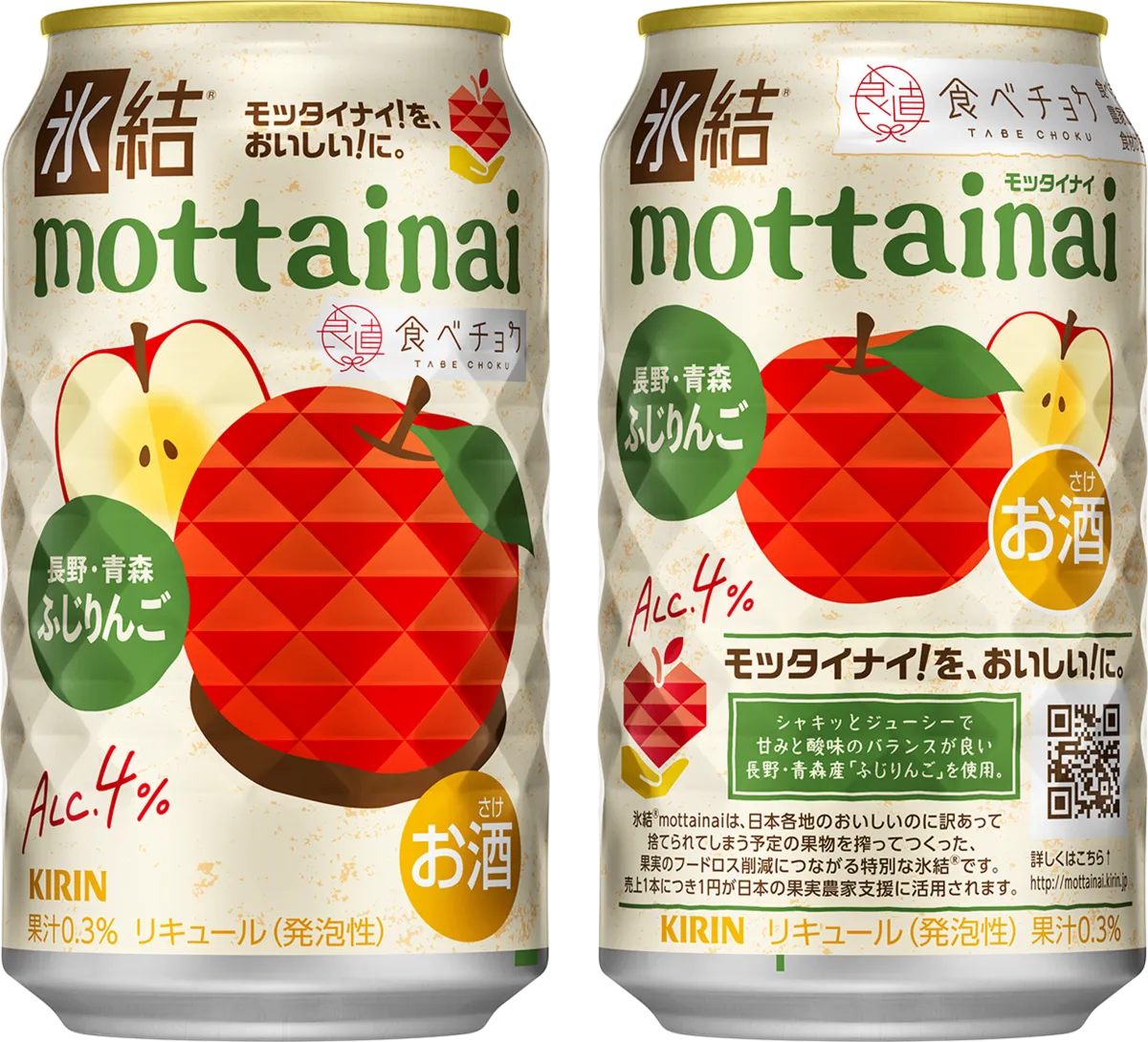 今回の「キリン 氷結®mottainai ふじりんご」は、フードロス対策だけでなく、販売を通じて2万8千個、約9.6トンの「モッタイナイ果実」の削減を目指しています。パッケージには「氷結®mottainai」のロゴとビジュアルが施されており、新しさと社会的責任を感じさせるデザインです。