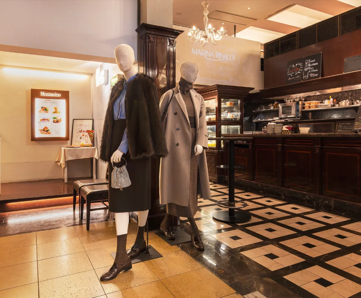 この企画では、三笠会館の1階にあるイタリアンバール「LA VIOLA」と、2階のイタリア料理店「Trattoria Mezzanino」で、両ブランドの魅力を存分に味わえます。特に注目すべきは、マリナ リナルディの2025年秋冬コレクションのルック展示やビジュアルインスタレーションです。この展示を通じて、ブランドの独自のスタイルや美学を直に体験することができます。