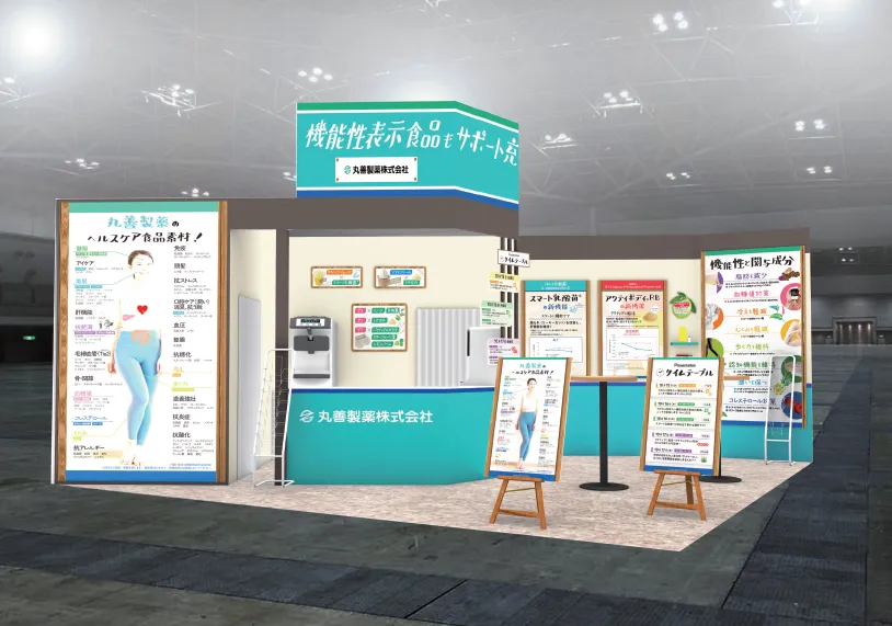 丸善製薬のブースでは、「あなたが欲しい素材がきっと見つかります!」というテーマのもと、機能性表示食品素材や試食品を展示します。来場者の方々には、見た目にもわかりやすい図表を通じて、機能性表示食品対応素材の特性や、認知機能に関する最新の研究データを確認していただけます。