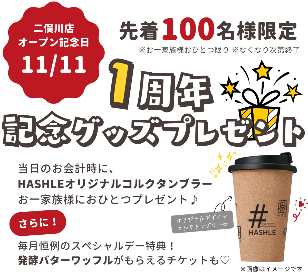 1周年を迎えるにあたり、HASHLEでは感謝の気持ちを込めて特別なノベルティ「コルクタンブラー」を用意しました。2025年11月11日(火)にご来店いただいたお客様に、お会計時に1家族につき1つプレゼントいたします。このコルクタンブラーは、HASHLEのオリジナルデザインが施されており、テイクアウトしたドリンクにもぴったりです。数量には限りがありますので、欲しい方はお早めにご来店いただくことをお勧めします。