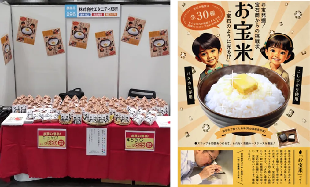 ジュエリーショップ エタニティーが初出展しました。この展示会では、バタめし専用のフードギフト「お宝米」が100個即完売という偉業を達成しました。