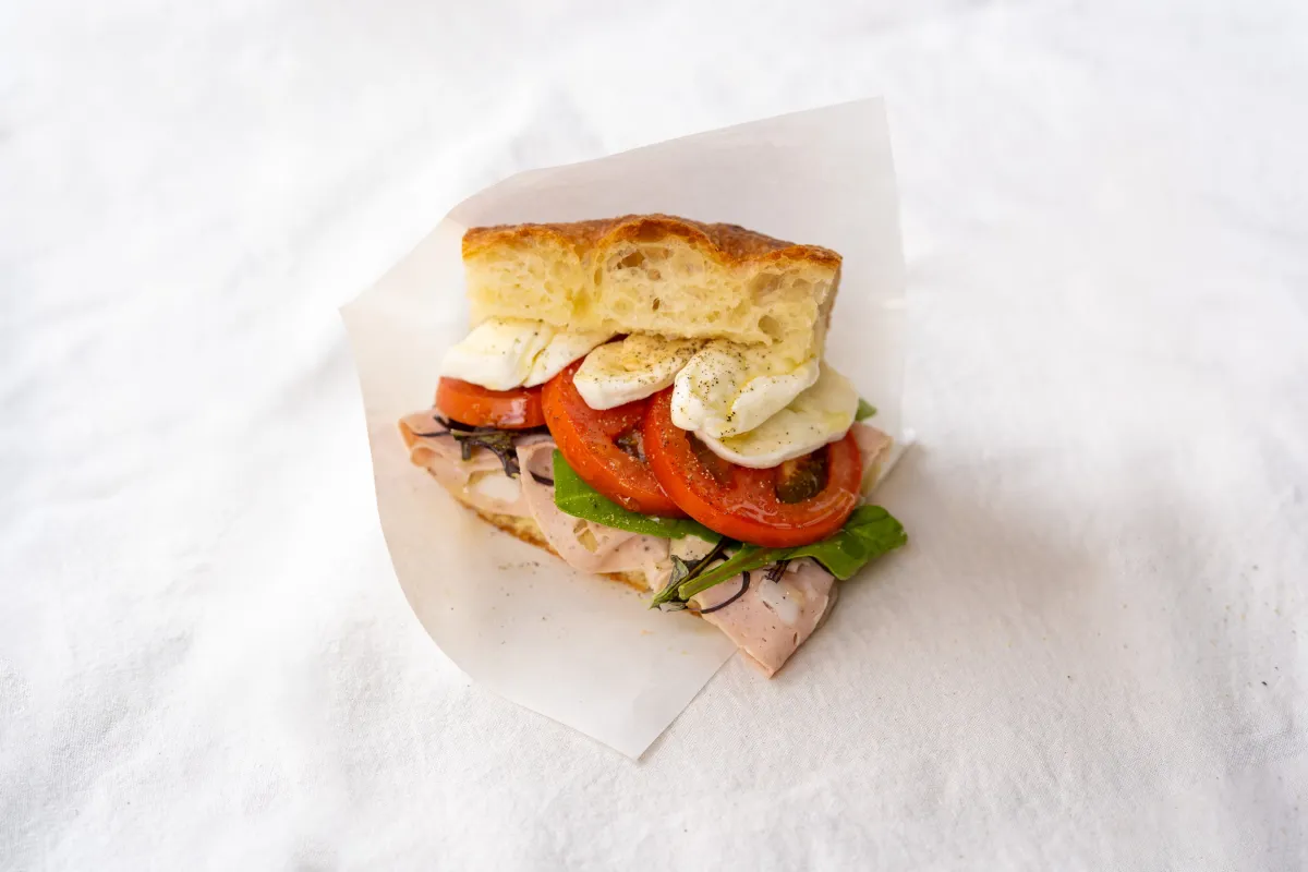 「TAKAYAMA」で味わえるパニーノは、シンプルながら素材の良さが引き立つものばかりです。まず一つ目は、モルタデッラとモッツァレラのパニーノ。しっとりとしたモルタデッラの食感と、トマト、モッツァレラの組み合わせが絶妙です。さらに、イタリアの伝統的なツナソース「サルサトンナート」の風味がプラスされ、味わい深い一品に仕上がっています。