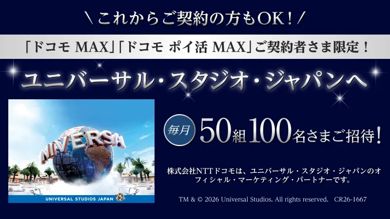 株式会社NTTドコモは、料金プラン「ドコモ MAX」および「ドコモ ポイ活 MAX」を契約するユーザーを対象に、ユニバーサル・スタジオ・ジャパンの「1デイ・スタジオ・パス(ペア)」を毎月50組、計100名様にプレゼントするキャンペーンを実施します。このキャンペーンは2026年5月1日からスタートし、ドコモの契約者向けの特別な体験価値の一環として提供されます。