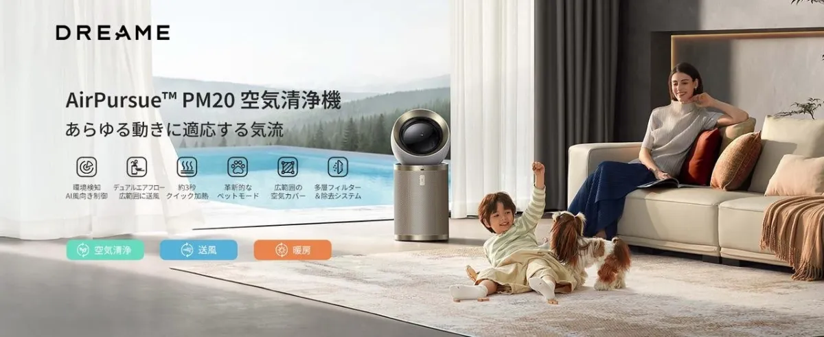 PM20は、リビングや寝室、書斎、子ども部屋など多くの空間で使用でき、季節やライフスタイルに合わせて快適な空気環境を実現します。特にペットを飼っている家庭でも有効に活用できる設計がされています。