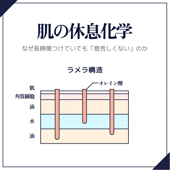 肌をふさがない柔らかな設計が特徴的です。ホホバ油、スクワラン、マカダミア油、オリーブオイルといった4種の植物オイルをバランスよく組み合わせ、肌に負担をかけない軽やかな仕上がりを実現しています。長時間つけていても重たさを感じず、自然な肌の動きはそのままに。