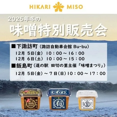 長野県で人気のあるオーガニック味噌や国産素材にこだわった味噌を特別価格で手に入れることができる「冬の味噌特別販売会」が、12月5日から7日までの期間に開催されます。このイベントは、ひかり味噌株式会社が主催し、地元の人たちに向けて日頃の感謝を伝えるためのもの。会場は、下諏訪町の「諏訪自動車会館Bu-bu」と飯島町の「道の駅田切の里」の二か所です。