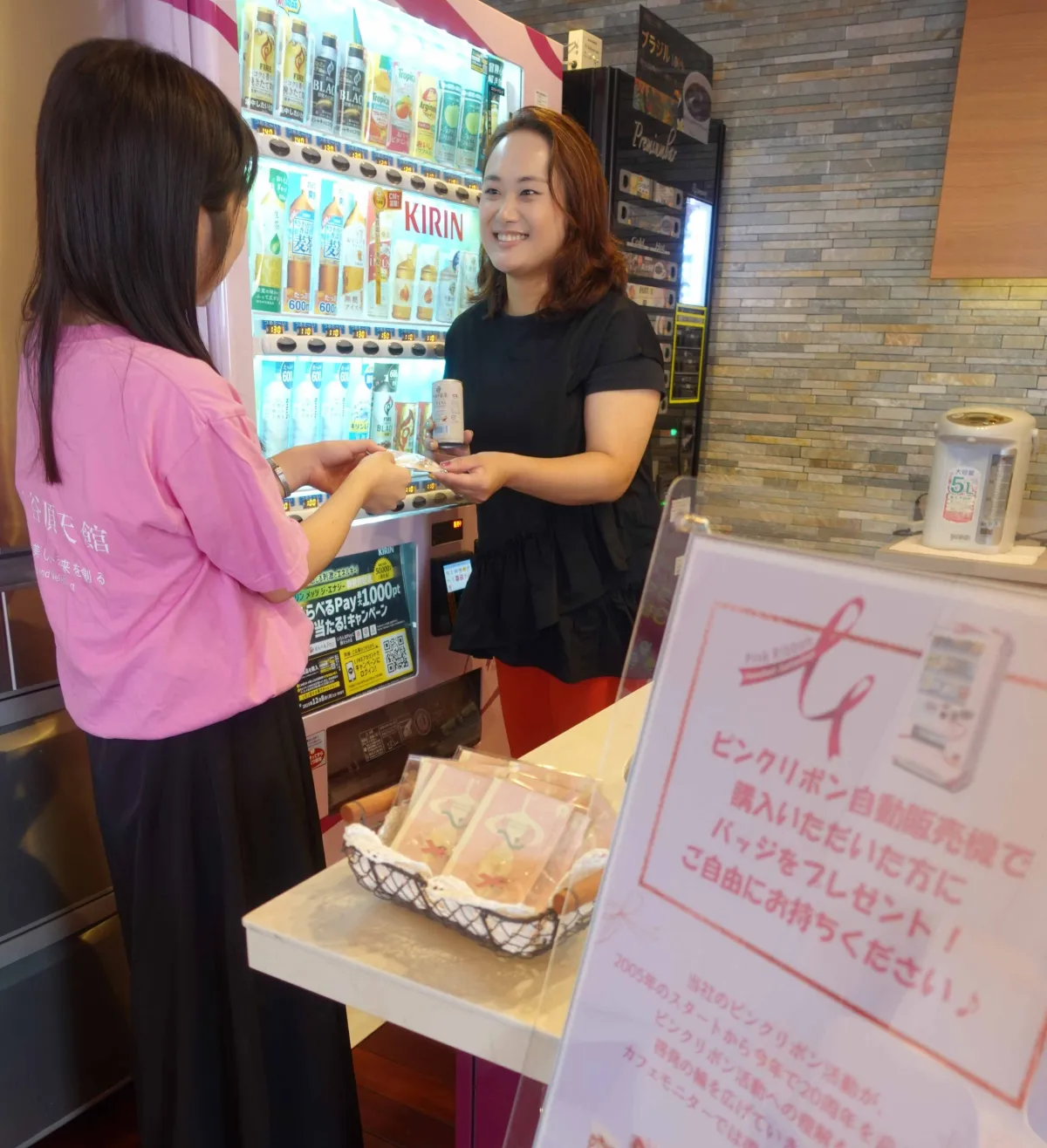 ピンクリボンハンドクリームの販売や、自動販売機での製品購入者にピンバッジを配布するなど、社内外で多様なアプローチが行われています。特筆すべきは、女性社員の乳がん検診受診率がほぼ