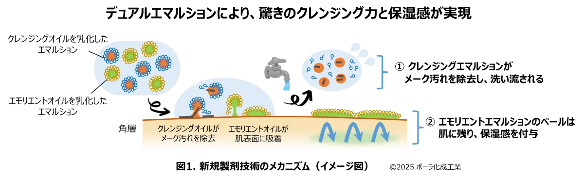 この革新的な技術の背後には、ポーラ化成工業が独自に研究してきた複合エマルションの技術があります。従来のクレンジングクリームは、その特性上、オイルが均一に混ざってしまうため、クレンジング効果を高めると保湿オイルも流されてしまうというトレードオフの課題がありました。