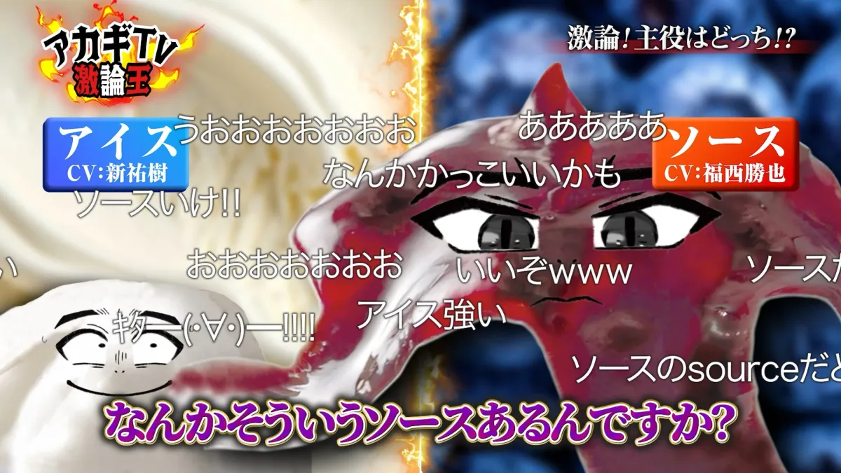 この討論には、実際に声優として活躍する新祐樹さんと福西勝也さんが登場します。新さんは氷のような冷静さでアイス役を演じ、福西さんは情熱的にソース役をつとめ、両者の緊迫したやり取りは必見です。
