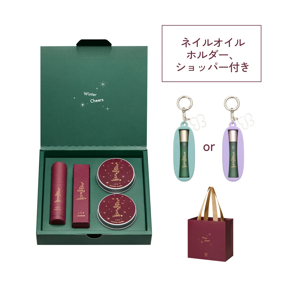 ホリデーコフレを購入すると、嬉しい特典として、限定のネイルオイルホルダーがもらえます。このホルダーはukaのロゴチャーム付きで、バッグやスマホに付けて持ち運べるデザイン。色も選べるので、自分だけのスタイルに合わせて楽しむことができます。このホルダーがあれば、いつでも手元の保湿が行える便利さを実感できるでしょう。