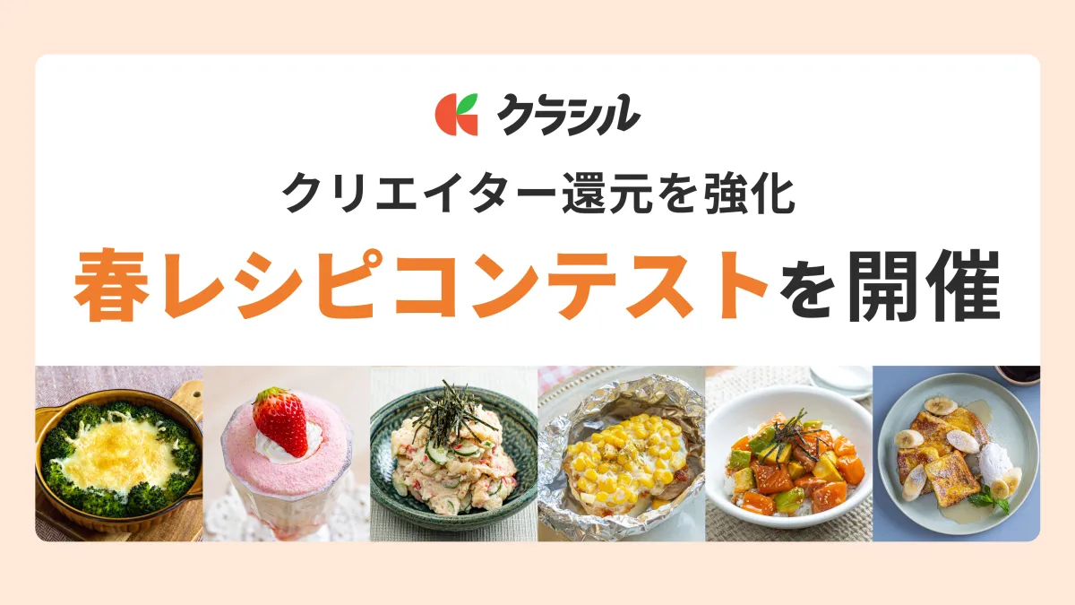 クラシル株式会社が運営するレシピ動画サービス「クラシル」は、クリエイターへの還元強化を目的に「クラシル 春レシピコンテスト2026」を開催することを発表しました。このコンテストは2026年4月23日から5月20日までの期間に、春にぴったりなレシピを募集します。