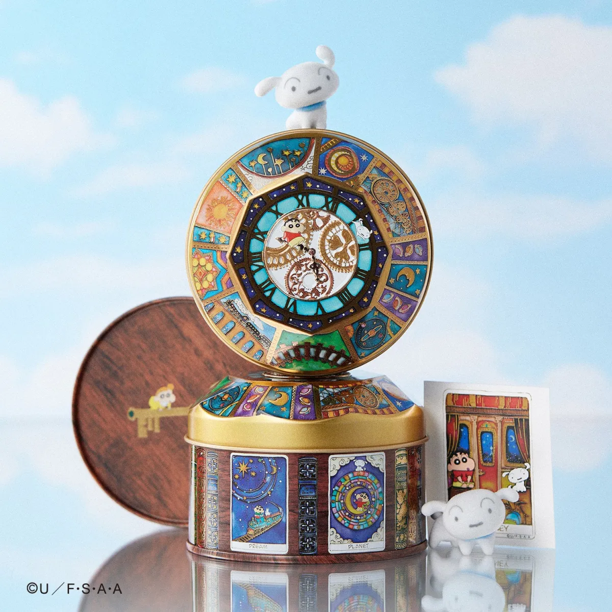 この缶の蓋には、アンティーク調の歯車時計が描かれており、その中央には遊ぶしんちゃんとシロの姿が見えます。そして、缶の側面には彼らが乗る魔法の列車が描かれ、宇宙の旅をテーマにした幻想的な風景が広がっています。デザインはまるでトランプカードのように細部まで工夫されていて、見ているだけで飽きが来ません。