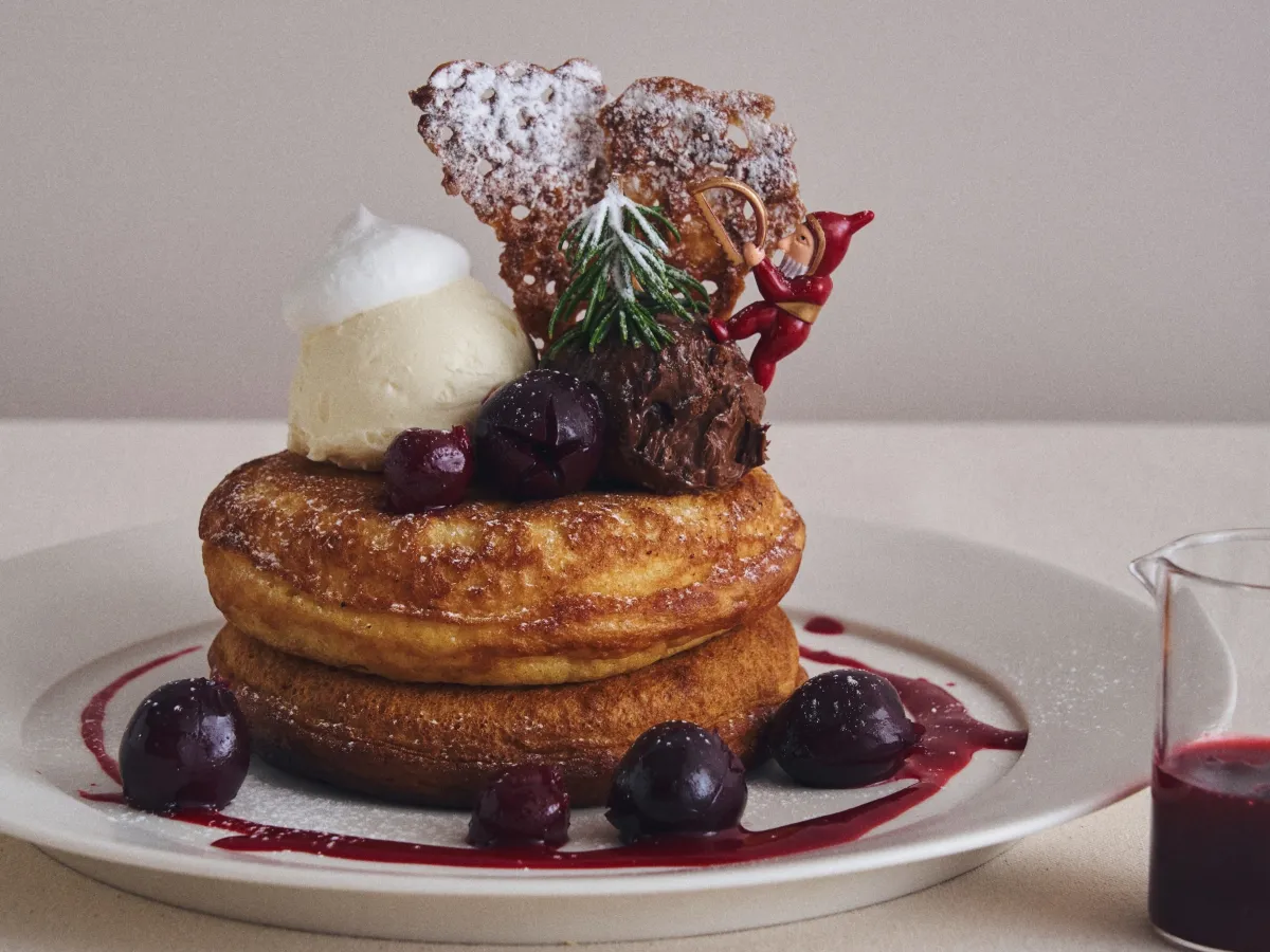 この特別なパンケーキは、2025年12月1日から31日までの間に販売され、冬のクリスマスシーズンにぴったりの一皿となっています。ふわっとしたパンケーキの上には、濃厚なショコラムースと甘酸っぱいグリオットチェリーのソースが重なり、深みのある味わいに仕上げられています。