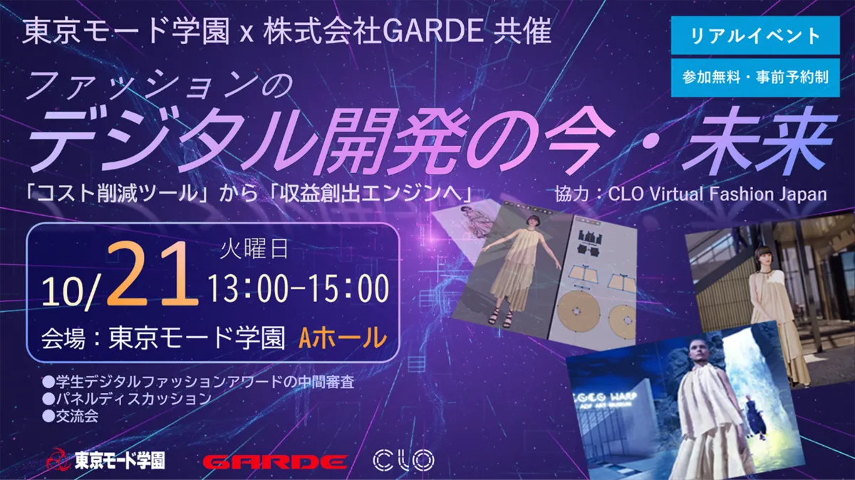 近年、ファッション業界では3D開発ツール「CLO」の導入が進んでいるものの、それを最大限に活用できている企業はまだ少ないのが実情です。そこで、GARDEと東京モード学園は、次世代のクリエイターである学生たちの独自の視点を活かし、デジタルファッションのビジネスにおける活用法を模索することを目的としています。